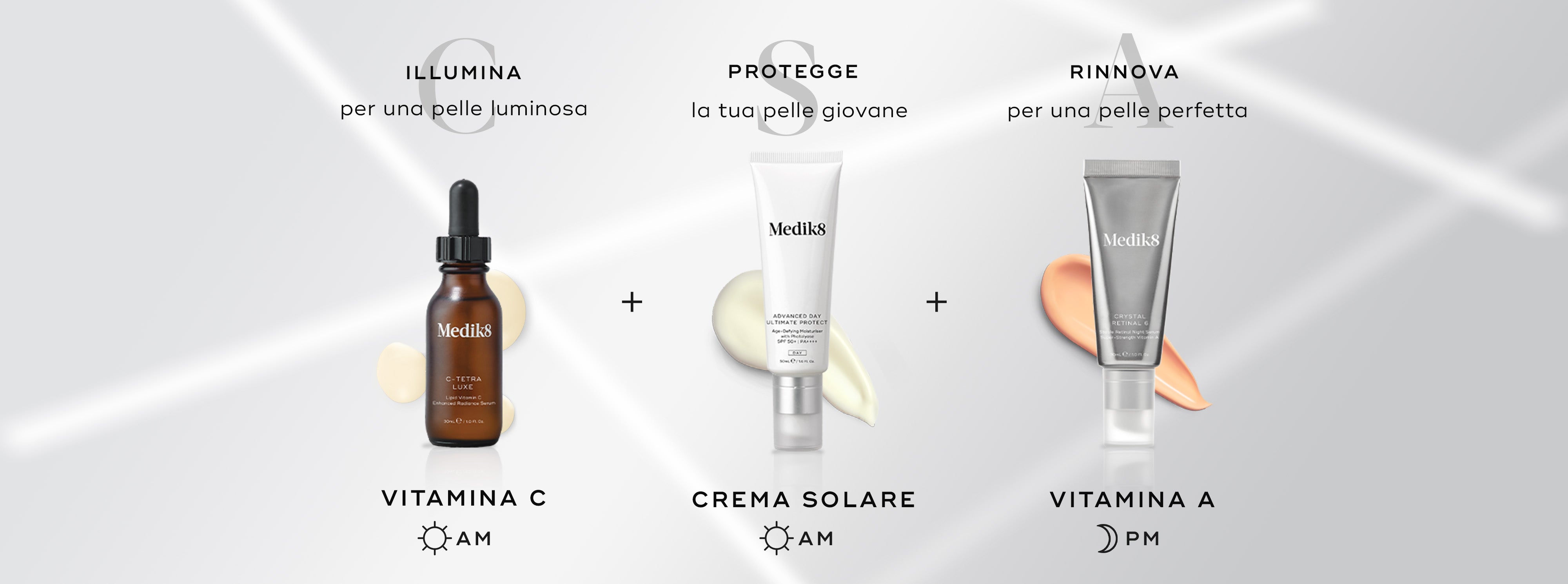 Enhance the visible benefits of daily UV protection by adding vitamin C and vitamin A to your regular skincare routine. This powerhouse trio is the holy grail to achieving more youthful-looking skin and makes up Medik8’s pioneering CSA Philosophy: vitamin C plus sunscreen by day, vitamin A by night. Follow this simple, clinically proven approach and discover Beautiful Skin for Life.