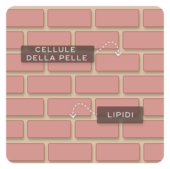 La barriera cutanea è lo strato superiore della pelle, noto anche come epidermide. La sua funzione principale è quella di mantenere l'idratazione essenziale e di tenere lontani gli agenti irritanti dell'ambiente. La barriera cutanea è formata da cellule cutanee e lipidi. Le cellule della pelle sono strettamente impacchettate l'una con l'altra (come i mattoni di un muro), mentre i lipidi agiscono come la malta che tiene insieme il muro.